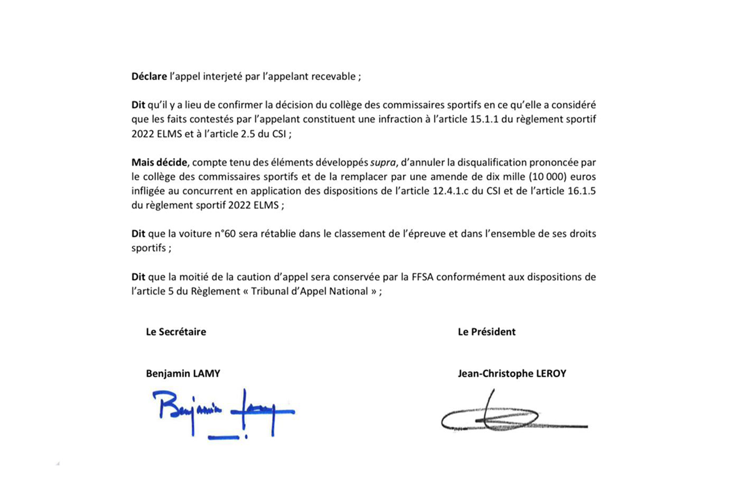 Disqualifié des 4 Heures de Monza à la suite d'une infraction au règlement sportif, Iron Lynx (Ferrari F488 GTE EVO #60) a finalement été déclaré vainqueur après avoir remporté son appel devant le Tribunal d'Appel National de la FFSA.