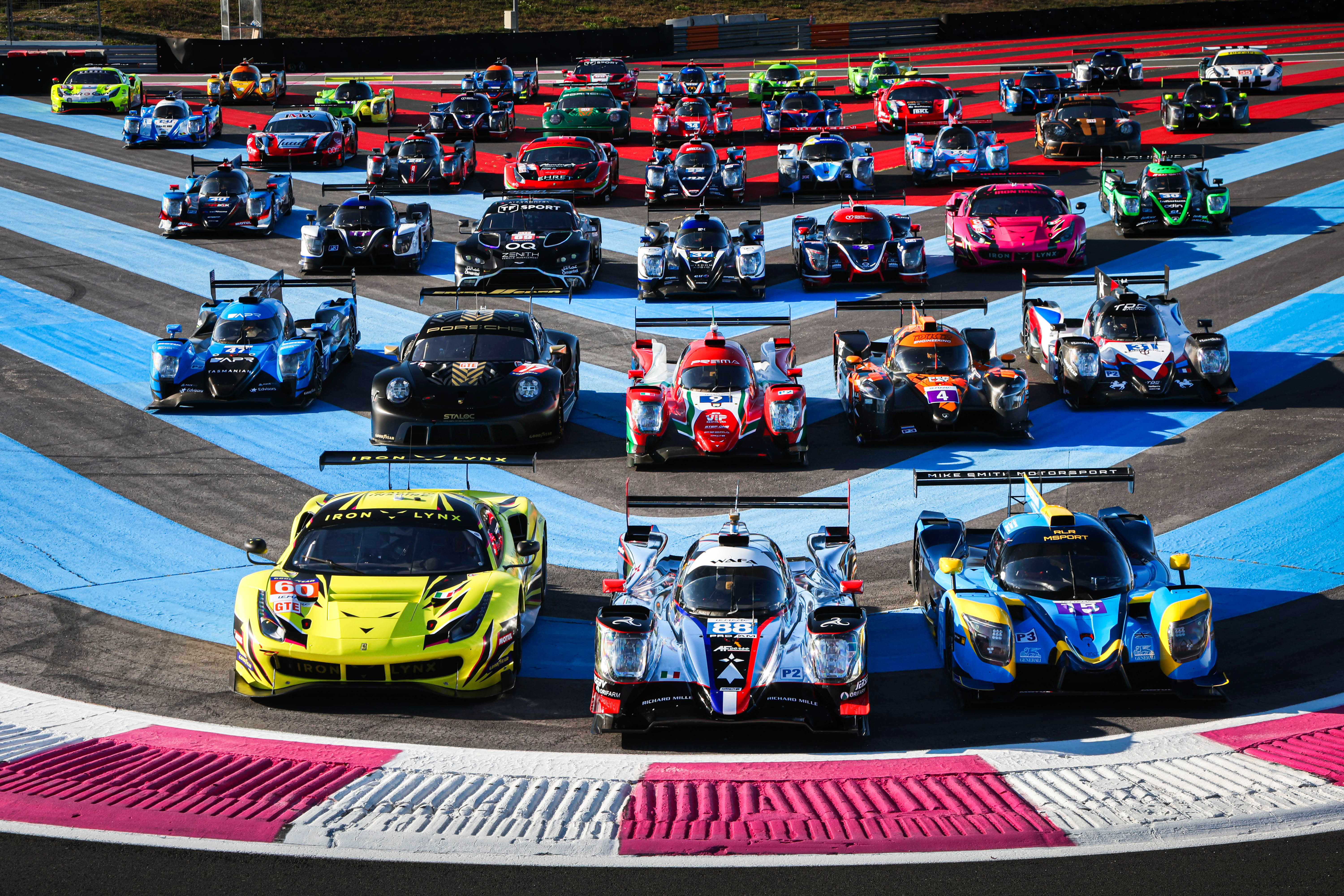 La grille de départ de la manche d'ouverture de l'European Le Mans Series 2022 s'est réunie au dernier virage pour la traditionnelle photo de groupe d'avant-saison sur les emblématiques bandes rouges et bleues du circuit Paul Ricard.
